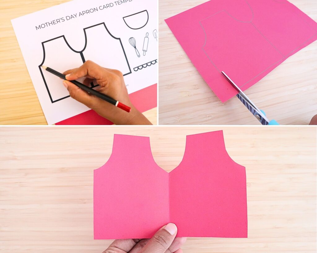 Using a pencil, trace the apron outline from the template onto the colored paper. Make sure to trace the full shape so the apron will fold like a card.
