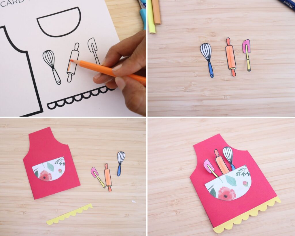 Start by printing the Mother’s Day apron card template on regular paper. This template includes the apron shape, pocket piece, and the small kitchen tools that will go inside the pocket.