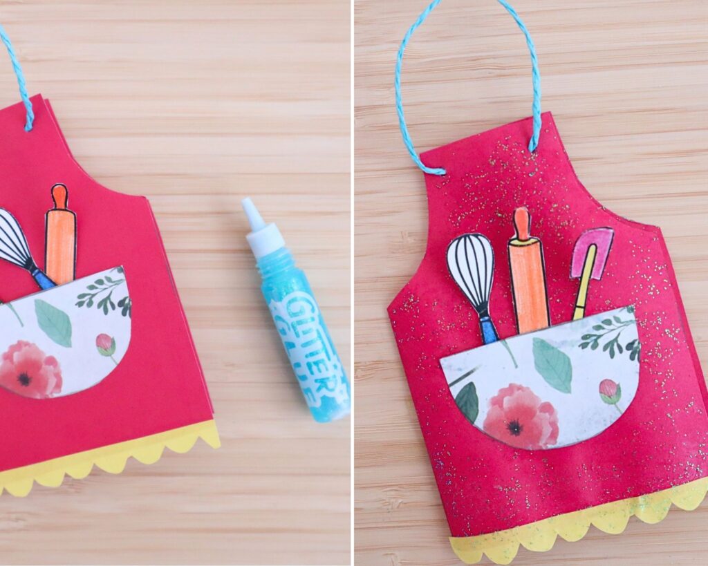 To finish the card, apply a little glitter glue around the apron for a fun sparkly effect.